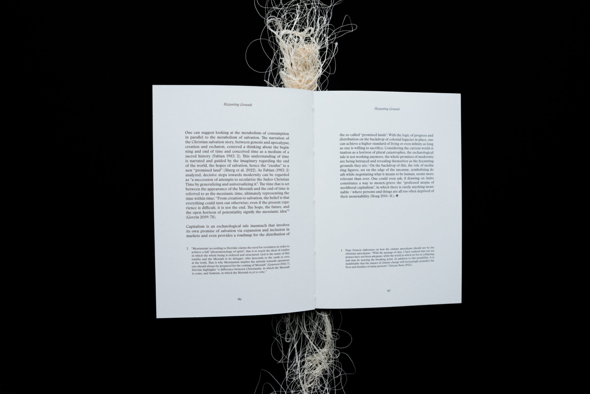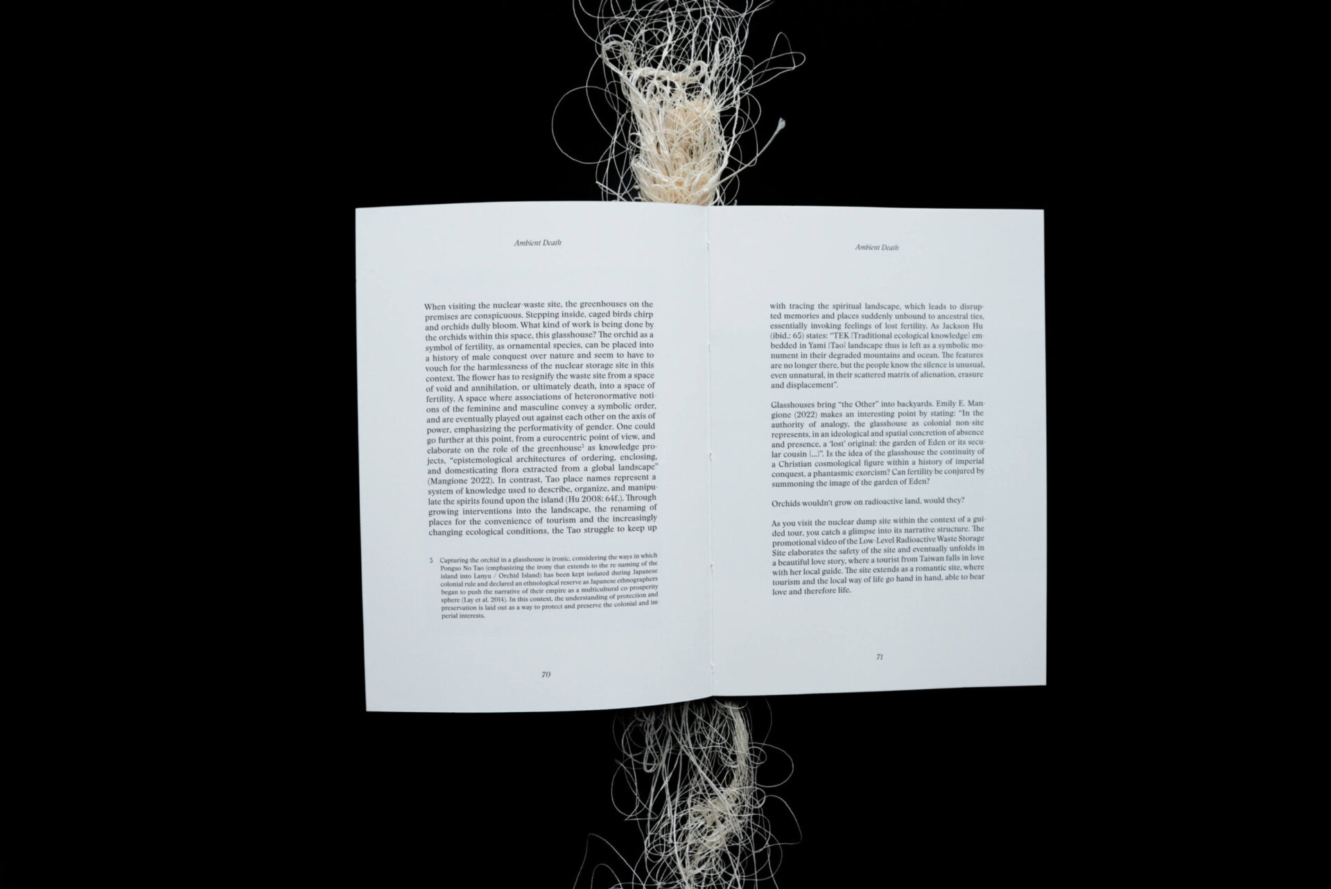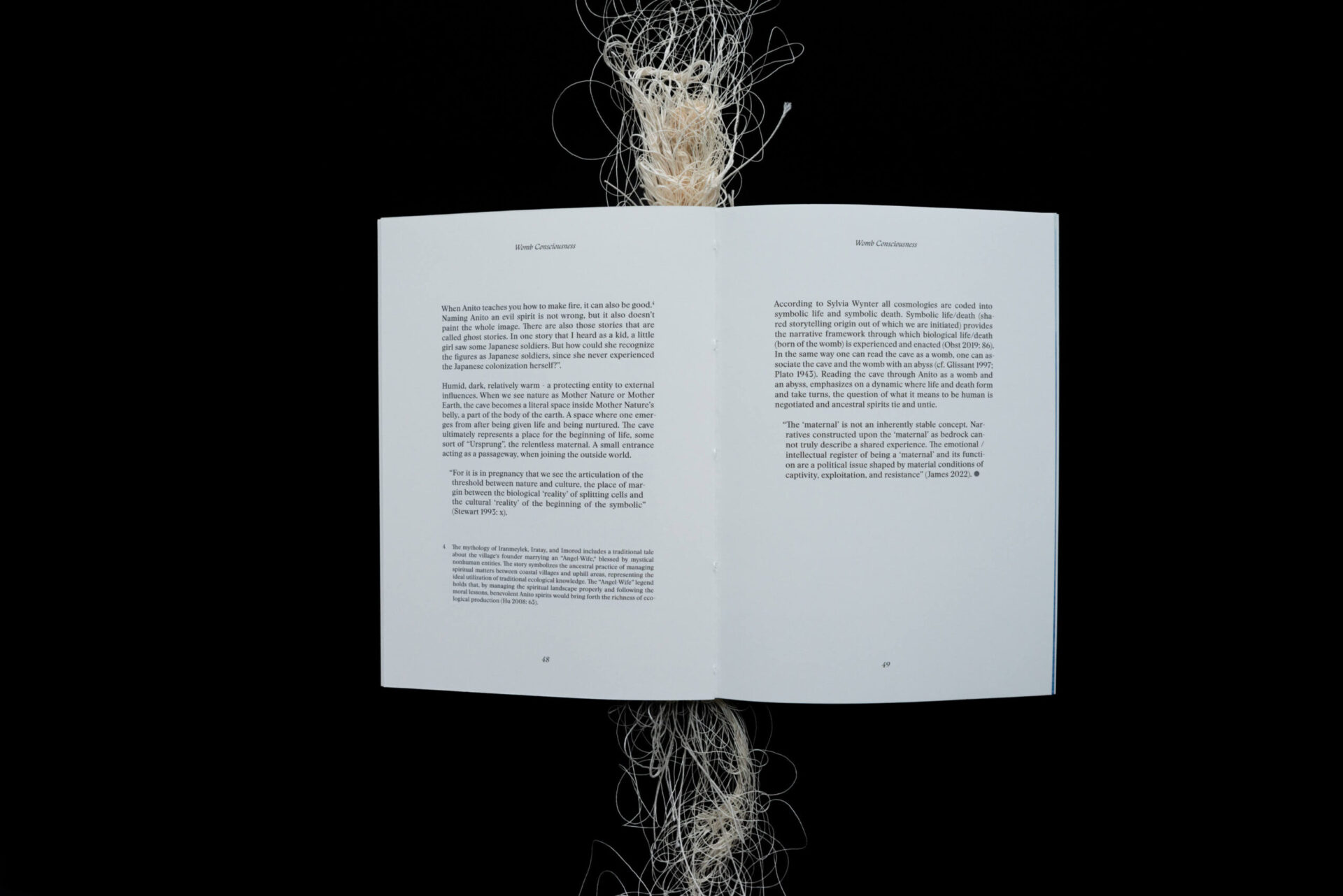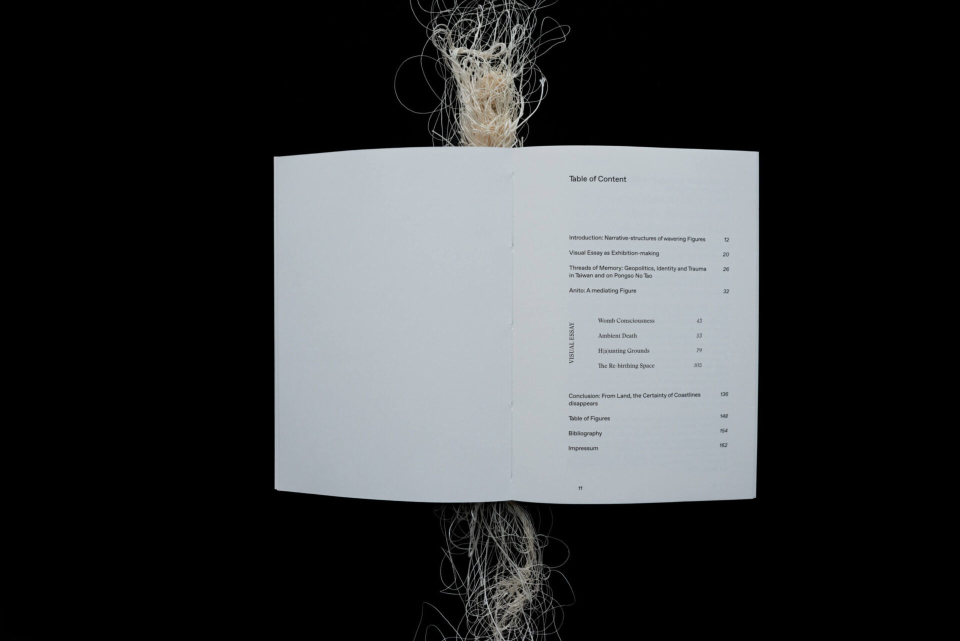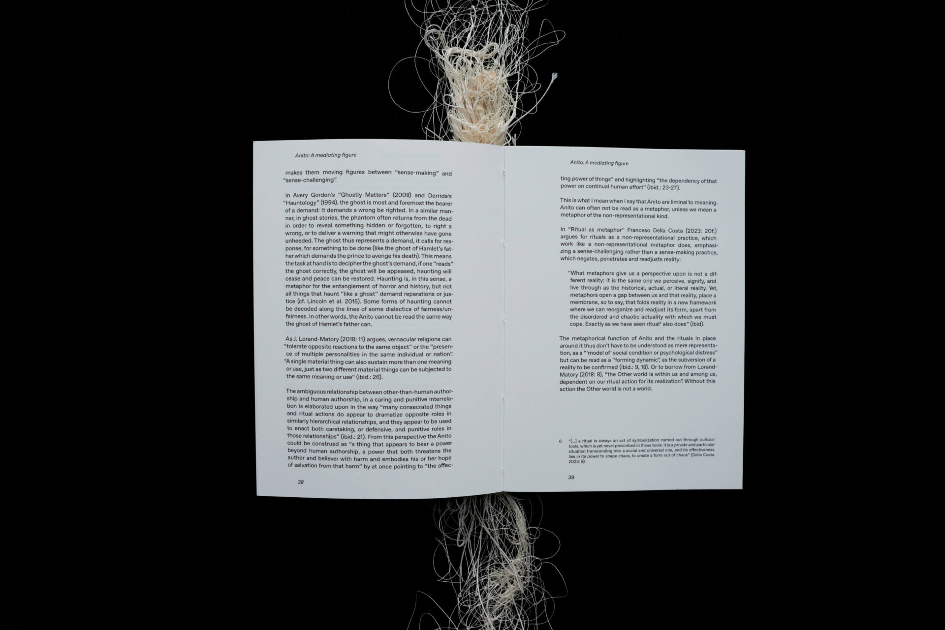 The thesis can be read as a curatorial endeavor. A speculative attempt to conduct an interdisciplinary curatorial research in the fields of post-colonial theory, theology, anthropology, history, visual and cultural studies. By employing the method of a visual essay, it constalated various cosmologies, portraying their intricate interplay fraught with friction. It created a work where connections emerged and tools to subvert the regime of the gaze were tested. Focusing on Anito, an ambient ancestral spirit from around the island of Pongso No Tao in Taiwan, the work positioned minor deities and ancestor spirits within the predicament of Christianity and the paradoxes of modernity. I drew on Anito – who hovers between malevolence and friendliness, the dead and the living, a mediating figure between the worlds – to investigate how one can narrate something from the perspective of a liminal entity, and if one can write against artificial boundary demarcations without reproducing them. By tapping into concepts of media, hauntology (Derrida, Gordon) and “crisis of presence” (De Martino) the work reflected how ritual practices and ghosts as (non-representational) metaphors un/settle time and space and mediate the struggle for life. It shed light on so-called paradoxes of modernity and laid out how modes of resistance at sites of extraction, colonial expansion, political ideology and the so-called markers of modernity (progress, development, modernization, industrialization, urbanization) may unfold. Ultimately the work positioned narrative-building, border-keeping logics and their tipping points and fault lines as an ultimate disjointedness of ontology, history, inheritance, materiality, and ideology at heart of curatorial practice.