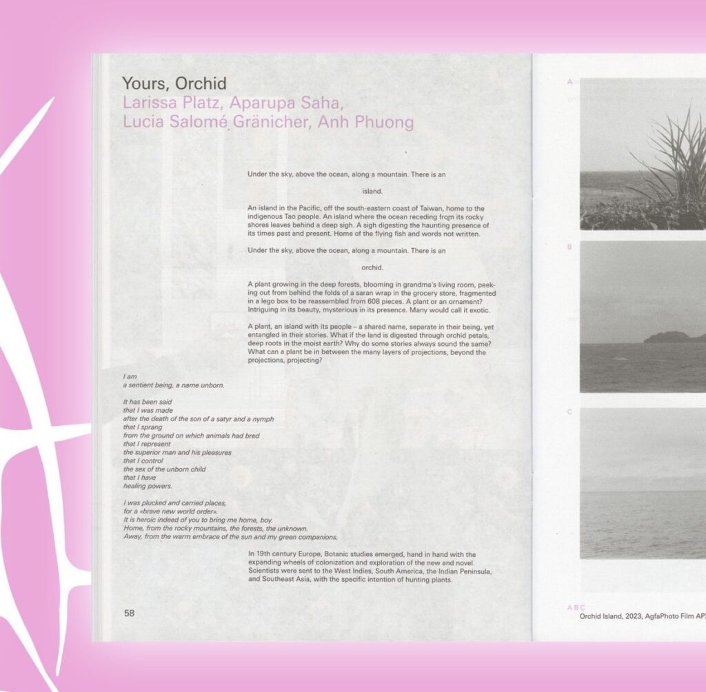 Collaborative essay project that dealt with the act of naming and claiming and understood the Orchid as a symbol of fertility, caught between male fantasies of conquest. With audio contributions that talked about the renaming of Pongso No Tao into Orchid Island and the role of names for one’s own identity.